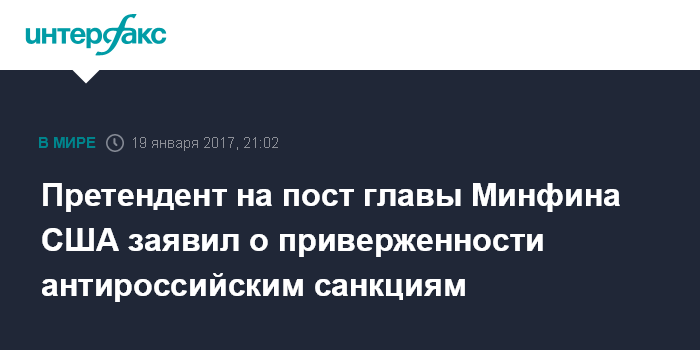 Москва. 19 января. INTERFAX.RU - Кандидат на пост главы американского Минфина Стивен Мнучин заявил в четверг, что привержен соблюдению санкций в отношении России, сообщает агентство Bloomberg.