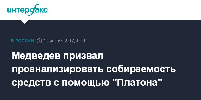 Москва. 20 января. INTERFAX.RU - Глава российского правительства Дмитрий Медведев призвал проанализировать работу системы взимания платы с грузовиков "Платон" в том числе с точки зрения собираемости средств, их перечисления в региональные дорожные фонды.