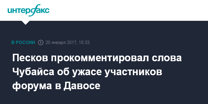 Таким образом пресс-секретарь главы государства прокомментировал заявление главы "Роснано" Анатолия Чубайса о том, что участники Давосского форума испытывают ужас от геополитической ситуации в мире. В частности, по мнению некоторых участников форума, вступление Дональда Трампа в должность президента США приведет к дестабилизации международной обстановки.