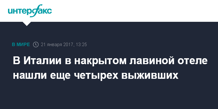 Москва. 21 января. INTERFAX.RU - Спасатели нашли еще четырех человек, выживших после схода снежной лавины на отель Rigopiano в горном регионе Абруццо в Италии, передает в субботу агентство Associated Press.