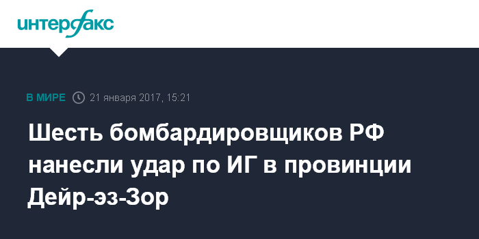 Москва. 21 января. INTERFAX.RU - Шесть дальних бомбардировщиков Ту-22М3 в субботу взлетели с территории России и нанесли групповой авиационный удар по объектам террористов ИГИЛ (группировка запрещена в РФ) в Сирии в провинции Дейр-эз-Зор, сообщили "Интерфаксу" в Минобороны РФ.