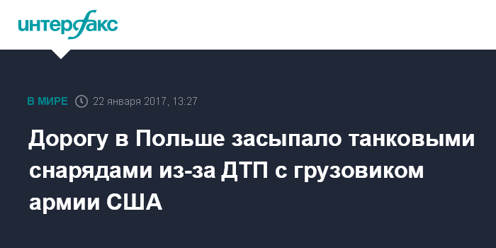 Москва. 22 января. INTERFAX.RU - В Польше американский военный грузовик попал в аварию, в результате которой из него высыпались танковые снаряды, сообщил Польский культурный центр в Калининграде со ссылкой на местные СМИ.