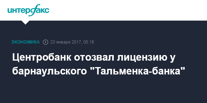 Москва. 23 января. INTERFAX.RU - Банк России с 23 января отозвал лицензию на осуществление банковских операций у барнаульского "Тальменка-банка", говорится в сообщении ЦБ.