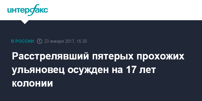 Москва. 23 января. INTERFAX.RU - Суд Железнодорожного района Ульяновска приговорил к 17 годам колонии строгого режима местного жителя Рустама Кашапова, который расстрелял пятерых незнакомых прохожих в ходе спонтанно возникшей ссоры.