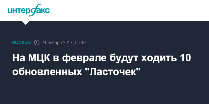 Москва. 24 января. INTERFAX.RU - Дополнительные пять обновленных поездов "Ласточка" будут запущены на Московском центральном кольце (МЦК) в феврале, сообщил заместитель мэра Москвы, руководитель департамента транспорта Максим Ликсутов.