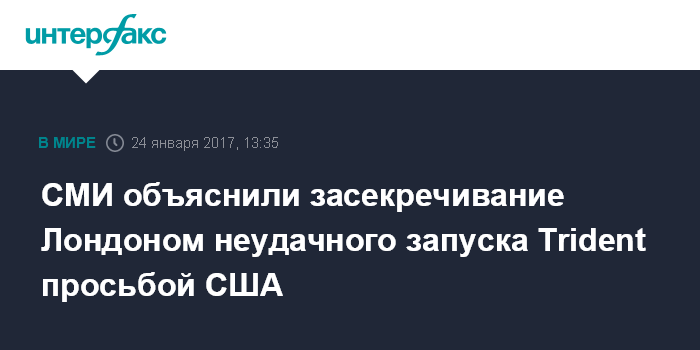 Москва. 24 января. INTERFAX.RU - Американские власти настоятельно просили Лондон не раскрывать информацию о неудачном запуске ракеты Trident II D5, сообщают во вторник британские СМИ.