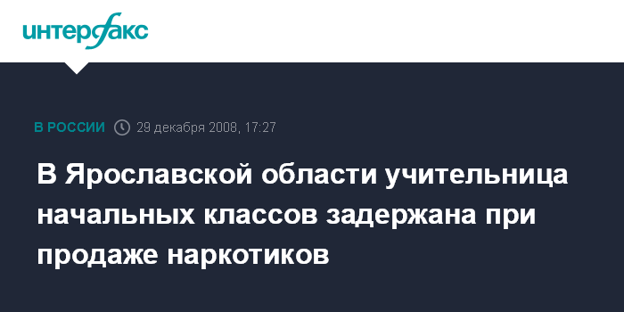 Москва. 29 декабря. INTERFAX.RU - В одном из сел Большесельского района Ярославской области при продаже марихуаны задержана учительница начальных классов местной школы, сообщили "Интерфаксу" в понедельник в пресс-службе Управления Федеральной службы РФ по контролю за оборотом наркотиков (ФСКН) по Ярославской области.