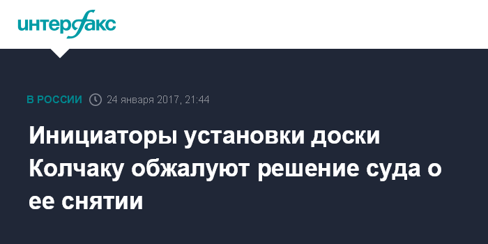 Москва. 24 января. INTERFAX.RU - Представители историко-культурного центра "Белое дело", инициировавшего установку памятной доски руководителю Белого движения во время Гражданской войны в России адмиралу Александру Колчаку в Петербурге, обжалуют решение суда о ее демонтаже, сообщили "Интерфаксу" в организации.