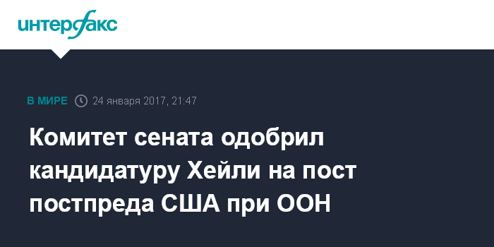Москва. 24 января. INTERFAX.RU - Члены сенатского комитета по международным делам одобрили во вторник кандидатуру губернатора Южной Каролины Никки Хейли на пост постоянного представителя США при ООН, сообщает агентство Associated Press.