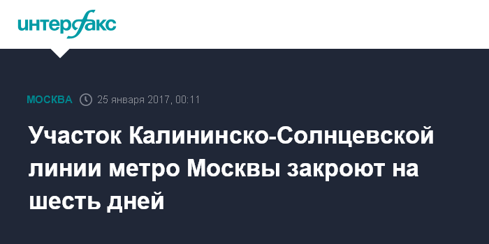 Москва. 25 января. INTERFAX.RU - Движение поездов на участке "Парк Победы"-"Деловой центр" Калининско-Солнцевской линии Московского метрополитена не будет осуществляться с 25 по 30 января, сообщили "Интерфаксу" в пресс-службе подземки.