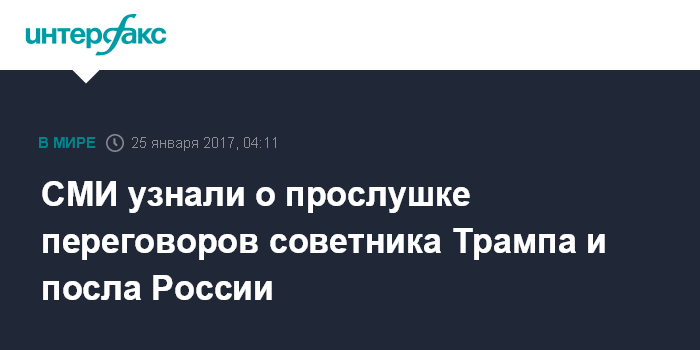 Москва. 25 января. INTERFAX.RU - ФБР прослушивало телефонные разговоры между советником президента США Дональда Трампа по вопросам нацбезопасности Майклом Флинном и российским послом РФ в США Сергеем Кисляком, но не обнаружило ничего подозрительного, сообщает телеканал NBC News со ссылкой на сотрудника разведки. По информации источника, "представители разведки всего-навсего слушали (разговоры-ИФ) как часть повседневной прослушки Кисляка".