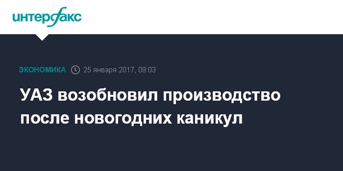"Последний день в прошедшем году сборку автомобилей мы осуществляли 30 декабря и, в соответствии с общефедеральным графиком, ушли на новогодние каникулы. Учитывая необходимость предприятия в плановой модернизации и развитии производства, в период с 9 по 24 января 2017 года на УАЗе проводилась ежегодная инвентаризация, профилактические и ремонтные работы в прессовом, сварочном, окрасочном производствах и в производстве сборки и сдачи автомобилей. Сегодня мы приступили к сборке автомобилей в штатном режиме", - сказал собеседник агентства.