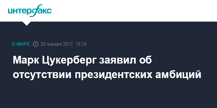 Москва. 25 января. INTERFAX.RU - Создатель соцсети Facebook Марк Цукерберг не планирует баллотироваться в президенты США и утверждает, что его новогоднее обещание посетить в 2017 году 30 штатов, в которых он еще не побывал, никак не связано с политическими амбициями. В интервью BuzzFeed Цукерберг сообщил, что намерен сосредоточиться на развитии Facebook и работе благотворительного фонда Chan Zuckerberg Initiative, который он создал вместе с женой - Присциллой Чан.