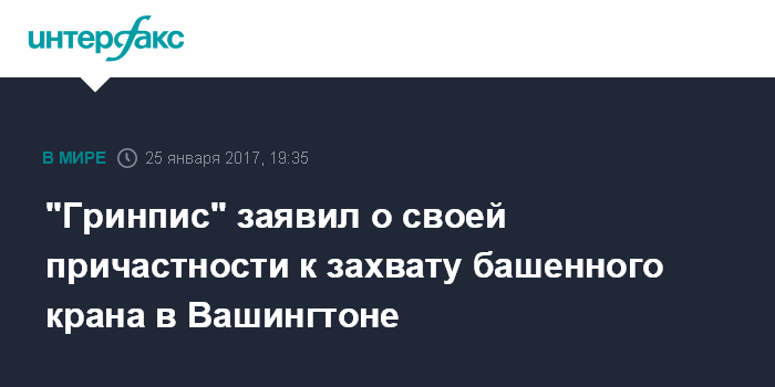 Москва. 25 января. INTERFAX.RU - Экологическая организация "Гринпис" взяла на себя ответственность за протест на строительной площадке в центре Вашингтона, сопровождавшийся захватом башенного крана, сообщает американский телеканал FoxNews.