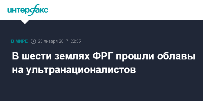 Москва. 25 января. INTERFAX.RU - Около 200 сотрудников полиции ФРГ участвовали в операции против предполагаемых членов ультранационалистической группировки, планировавшей нападения на евреев и лиц, подавших заявление о предоставлении убежища, сообщает в среду немецкий телеканал "Эн-24".