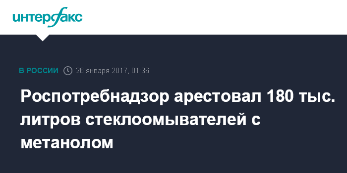 "Специалистами Роспотребнадзора в 44 субъектах Российской Федерации на 291 объекте установлены факты розничной реализации стеклоомывающей жидкости с содержанием метанола и выявлены три производственных объекта, в продукции которых было установлено наличие метанола. По результатам надзорных мероприятий специалистами Роспотребнадзора арестовано порядка 180 тыс. литров стеклоомывающей жидкости", - говорится в сообщении.