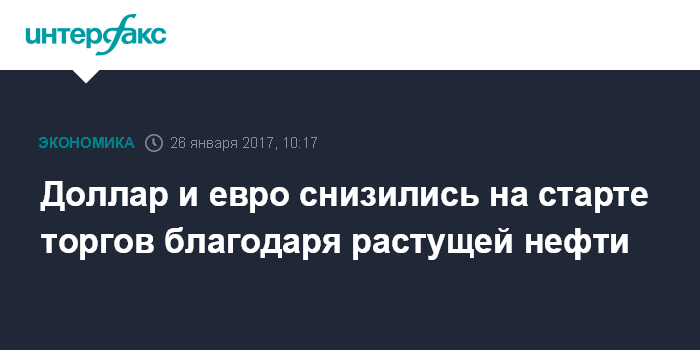 По мнению экспертов "Интерфакс-ЦЭА", небольшое укрепление рубля к доллару и евро в начале торгов 26 января связано с ростом мировых цен на нефть на заявлениях министра нефти Кувейта Эссама аль Марзука о полной приверженности государств ОПЕК соглашению о сокращении добычи. Некоторые из стран ОПЕК пока не уменьшили добычу в полном объеме, однако они будут наращивать темпы ее сокращения в ближайшее время, и полностью привержены выполнению условий достигнутого ранее соглашения об уменьшении производства нефти, заявил Э.аль Марзук в среду. На этом фоне стоимость мартовских фьючерсов на нефть Brent на лондонской бирже ICE Futures к 10:01 МСК поднялась на 0,85% - до $55,55 за баррель. Цена фьючерса на нефть WTI на март на электронных торгах Нью-йоркской товарной биржи (NYMEX) увеличилась к этому времени на 0,82% - до $53,18 за баррель.