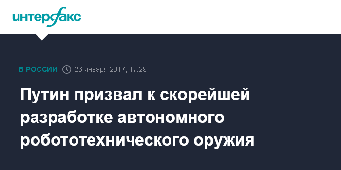 Москва. 26 января. INTERFAX.RU - Президент РФ Владимир Путин призвал к скорейшей разработке автономных робототехнических видов оружия, способных кардинально изменить систему вооружений сил.