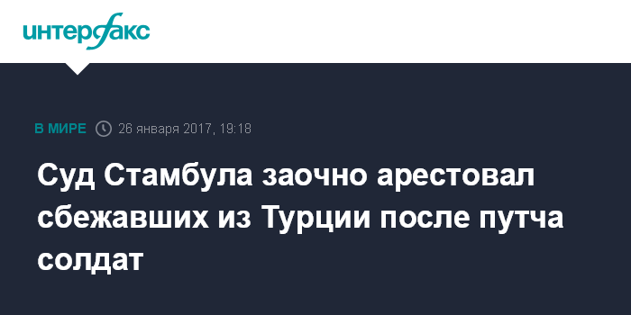 Москва. 26 января. INTERFAX.RU - Стамбульский суд издал заочный ордер на арест восьми турецких солдат, подозреваемых в причастности к неудавшейся попытке переворота в июле прошлого года, сообщает в четверг турецкая газета Sabah.
