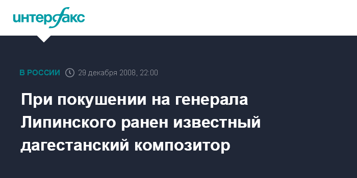 Москва. 29 декабря. INTERFAX.RU - Во время обстрела автомобиля, в котором находился генерал-майор МВД Валерий Липинский, ранение вместе с ним получил и известный дагестанский композитор Магомед Касумов, сообщили "Интерфаксу" в следственном управлении СКП по Дагестану.