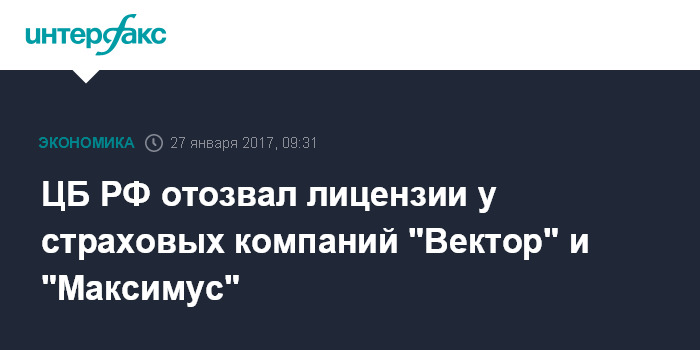 ЦБ РФ отозвал лицензии у страховых компаний "Вектор" и "Максимус"