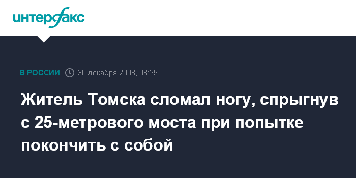 Москва. 30 декабря. INTERFAX.RU - Житель Томска выжил после того, как попытался покончить жизнь самоубийством, спрыгнув с моста через реку Томь.
