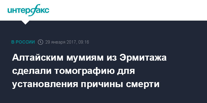 Москва. 29 января. INTERFAX.RU - Древние мумии из коллекции Государственного Эрмитажа просканировали на рентгеновском компьютерном томографе, чтобы установить причину смерти и возможные болезни. Как сообщила пресс-служба компании, предоставившей аппарат для сканирования, объектами исследования стали две мумии III века до нашей эры из пятого Пазырыкского кургана, раскопанного в 1949 году в Горном Алтае.