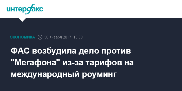 Москва. 30 января. INTERFAX.RU - Федеральная антимонопольная служба 26 января возбудила дело в отношении "Мегафона" по признакам нарушения закона о защите конкуренции, сообщило ведомство.