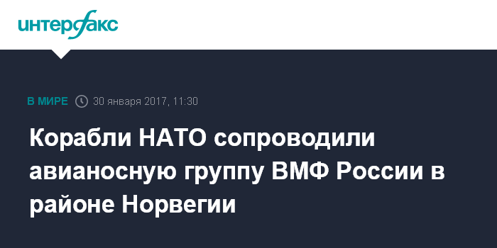 Москва. 30 января. INTERFAX.RU - Авианосная ударная группа Северного флота, возвращающаяся на базу в Североморск из похода в Средиземноморье, в настоящее время идет вдоль норвежского побережья под наблюдением кораблей НАТО, свидетельствуют данные международной Автоматической идентификационной системы.
