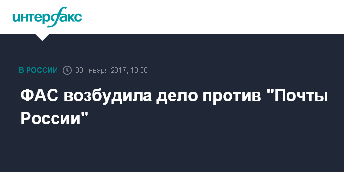 Москва. 30 января. INTERFAX.RU - Федеральная антимонопольная служба (ФАС) РФ 28 февраля рассмотрит дело в отношении ФГУП "Почта Россия", которую заподозрили в нарушении закона о защите конкуренции, говорится в сообщении ведомства.
