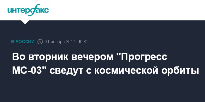 Москва. 31 января. INTERFAX.RU - Космический грузовик "Прогресс МС-03" будет сведен с орбиты во вторник вечером, сообщил "Интерфаксу" источник в ракетно-космической отрасли.