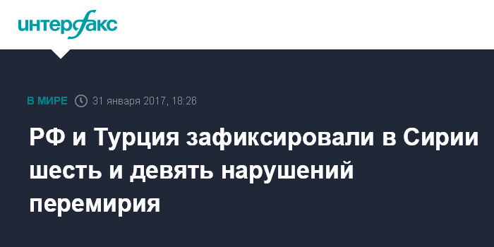 "Российской частью представительства совместной российско-турецкой комиссии по рассмотрению вопросов, связанных с нарушениями Единого соглашения, за сутки зафиксировано шесть нарушений в провинциях Латакия (три) и Хама (три). Турецкой частью представительства зафиксировано девять нарушений Единого соглашения в провинциях Дамаск (три), Алеппо (два), Хомс (два), Идлиб (одно) и Латакия (одно)", - говорится в бюллетене российского Центра по примирению враждующих сторон в Сирии.