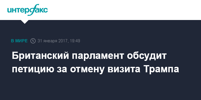 Москва. 31 января. INTERFAX.RU - Парламент Великобритании обсудит 20 февраля петицию с призывом отменить государственный визит президента США Дональда Трампа в Соединенное Королевство, сообщается на сайте парламента.