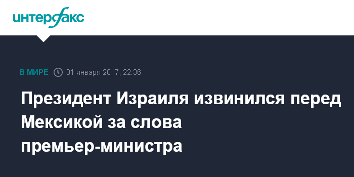 Москва. 31 января. INTERFAX.RU - Президент Израиля Реувен Ривлин извинился перед своим мексиканским коллегой Пеньей Ньето за высказывание премьер-министра Биньямина Нетаньяху, который горячо поддержал строительство стены на границе с США, передает во вторник The Guardian.