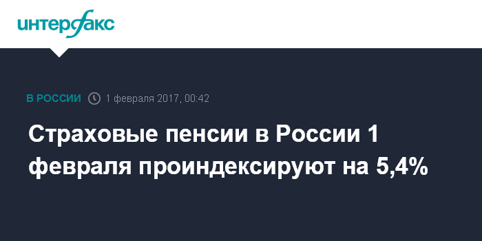 Москва. 1 февраля. INTERFAX.RU - Страховые пенсии и социальные выплаты в РФ начинают индексироваться на 5,4%. Соответствующее решение было ранее принято правительством.