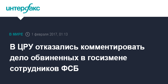 Москва. 1 февраля. INTERFAX.RU - Центральное разведывательное управление (ЦРУ) США не комментирует сообщения о том, что арестованные по делу о госизмене и хакерах сотрудники ФСБ России обвиняются в передаче конфиденциальной информации ЦРУ.