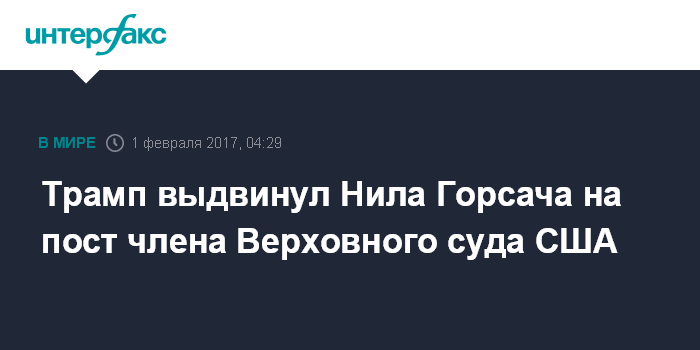Москва. 1 февраля. INTERFAX.RU - Президент США Дональд Трамп во вторник выдвинул кандидатуру Нила Горсача на пост судьи Верховного суда, передает CNN.