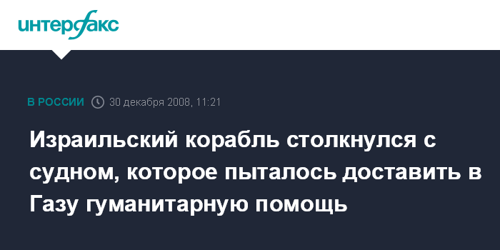 Москва. 30 декабря. INTERFAX.RU - Корабль израильских ВМС не пропустил в сектор Газа судно с грузом гуманитарной помощи, зафрахтованного активистами Движения за освобождение Газы.