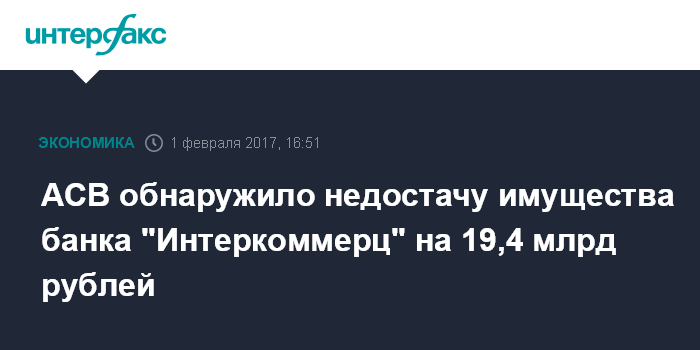 Москва. 1 февраля. INTERFAX.RU - Агентство по страхованию вкладов по итогам инвентаризации имущества банка "Интеркоммерц" выявило недостачу на 19,4 млрд рублей, говорится в материалах на сайте АСВ. АСВ является конкурсным управляющим банка "Интеркоммерц", который лишился лицензии в феврале 2016 года. Инвентаризация имущества, проведенная по состоянию на дату открытия процедуры конкурсного производства (29 апреля 2016 года), полностью завершена 29 января 2017 года.