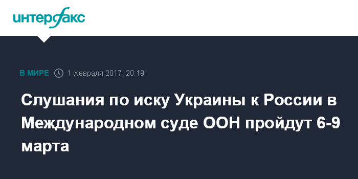 Москва. 1 февраля. INTERFAX.RU - Слушания в Международном суде ООН в Гааге (Нидерланды) по иску украинской стороны для привлечения России к ответственности за совершение актов терроризма и расовой дискриминации пройдут 6-9 марта 2017 года.