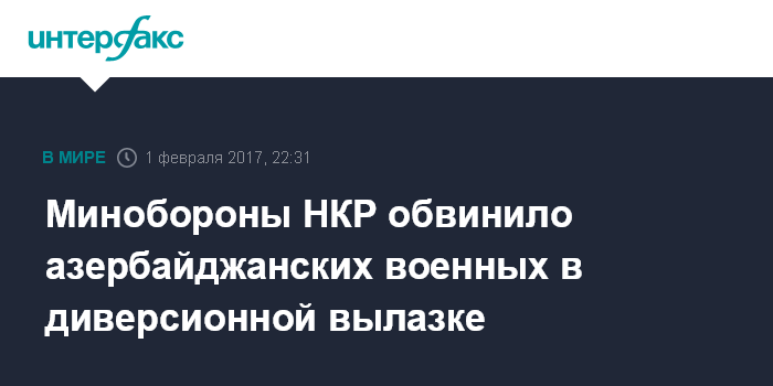 Москва. 1 февраля. INTERFAX.RU - Вооруженные силы Азербайджана днем в среду предприняли попытку диверсионно-разведывательного проникновения на территорию непризнанной Нагорно-Карабахской республики (НКР), сообщает пресс-служба Минобороны НКР.