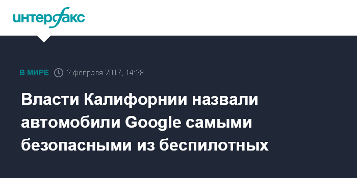 Москва. 2 февраля. INTERFAX.RU - Технология Google, позволяющая машинам ездить по дорогам без водителя, превосходит аналогичные разработки конкурентов в плане безопасности, говорится в отчете властей штата Калифорния.