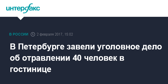 Москва. 2 февраля. INTERFAX.RU - В Санкт-Петербурге возбуждено уголовное дело по факту нарушения санитарно-эпидемиологических правил в гостинице "Балтийская", где отравились более 40 человек, сообщает сайт ГСУ СКР по Санкт-Петербургу.