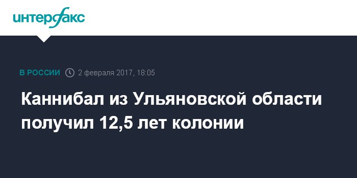 Москва. 2 февраля. INTERFAX.RU - Суд в Ульяновской области приговорил в четверг к 12 годам и шести месяцам колонии строгого режима местного жителя Олега Холодова, который убил и съел своего знакомого, сообщает областная прокуратура.
