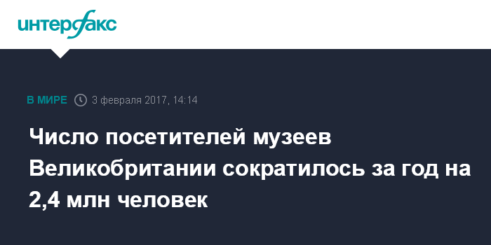 Москва. 3 февраля. INTERFAX.RU - Количество посетителей британских музеев и галерей за год сократилось примерно на 2,4 млн человек, свидетельствуют данные министерства культуры, СМИ и спорта. За год, который завершился 30 апреля 2016 года, самые известные музеи страны посетило 47,6 млн человек, в то время как в предшествующий год число посетителей достигло рекордных 50 млн человек.