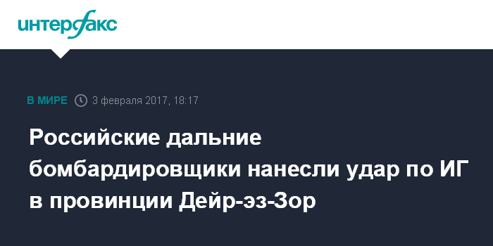 Москва. 3 февраля. INTERFAX.RU - Российские дальние бомбардировщики Ту-22М3 в пятницу нанесли новый удар по объектам террористической группировки ИГ (запрещена в РФ) в районе города Аль-Маядин в сирийской провинции Дейр-эз-Зор, сообщили в Минобороны РФ.