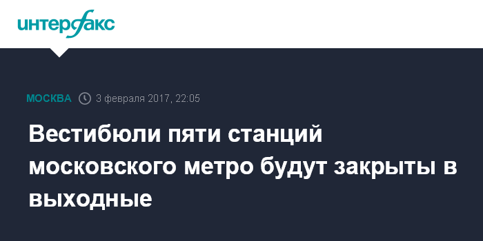 Москва. 3 февраля. INTERFAX.RU - В предстоящие выходные для проведения работ по благоустройству будут закрыты вестибюли пяти станций Московского метрополитена, сообщили "Интерфаксу" в пресс-службе подземки.