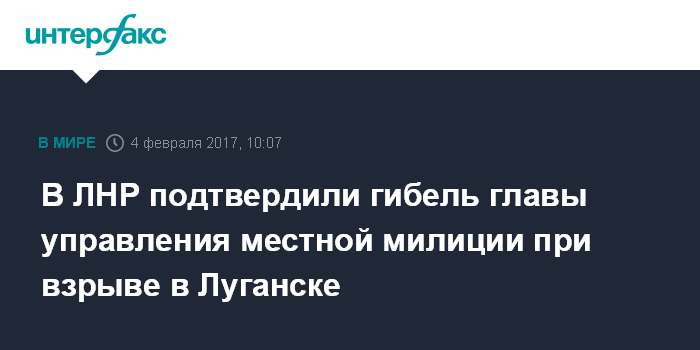 Москва. 4 февраля. INTERFAX.RU - Начальник управления народной милиции самопровозглашенной Луганской народной республики погиб при взрыве автомобиля в Луганске, сообщает в субботу Луганский информационный центр.