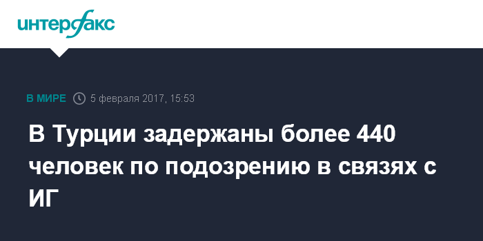 Москва. 5 февраля. INTERFAX.RU - Турецкая полиция задержала более 440 человек по подозрению в связях с террористической группировкой "Исламское государство" (ИГ, запрещена в России), сообщает в воскресенье агентство Anadolu.