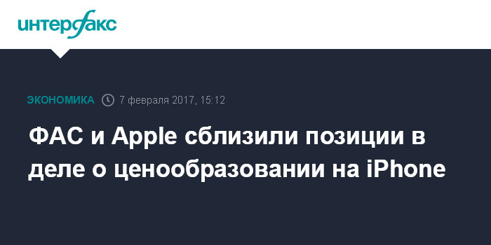Москва. 7 февраля. INTERFAX.RU - Федеральная антимонопольная служба России и американская Apple "сблизили позиции" в рамках разбирательства о возможной координации цен на смартфоны iPhone, сообщил журналистам глава ФАС Игорь Артемьев.